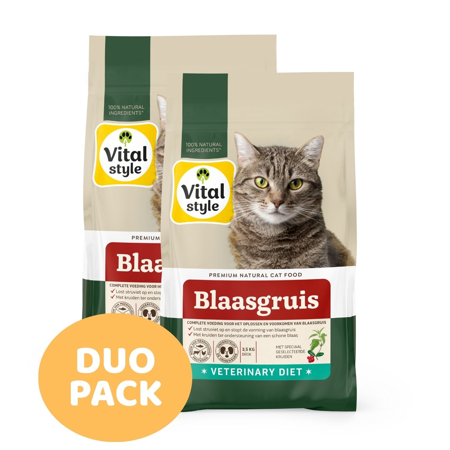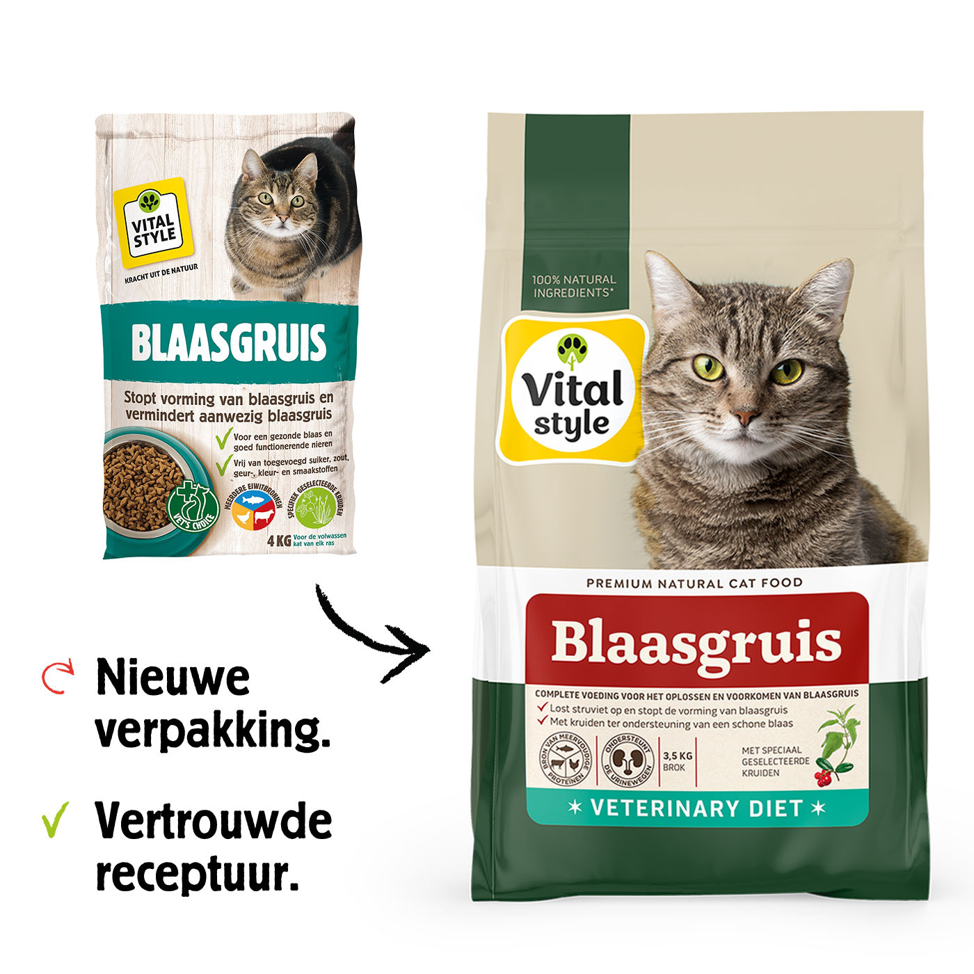 De speciale Blaasgruis kattenvoeding van VITALstyle (voorheen Ecostyle) helpt al aanwezig blaasgruis (struviet) te verminderen en voorkomt de vorming van blaasgruis door de urinverzurende werking. Het bevat een laag magnesium, fosfor en eiwitgehalte (echter wel hoogwaardig eiwit) waardoor het risico op de vorming van struviet wordt verkleind. Het bevat urineverzurende stoffen waardoor bestaande struivietkristallen en -stenen worden opgelost. De ingredienten van Blaasgruis kattenvoeding zorgen voor een goede blaaswerking. Daar worden kat en baas vrolijk van!