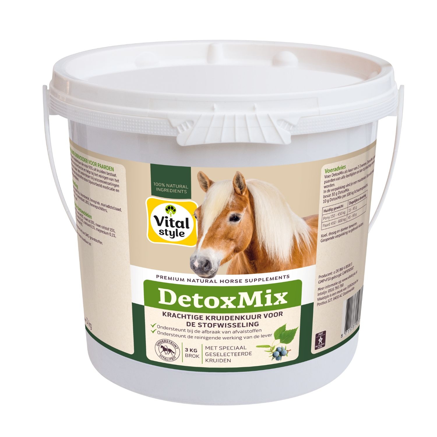 Het lichaam produceert veel vrije radicalen (afvalstoffen), die door de lever moeten worden afgebroken. VITALstyle (voorheen ECOstyle) DetoxMix is dé ondersteuning voor een goede afvoer van afvalstoffen en optimale stofwisseling voor ieder paard!