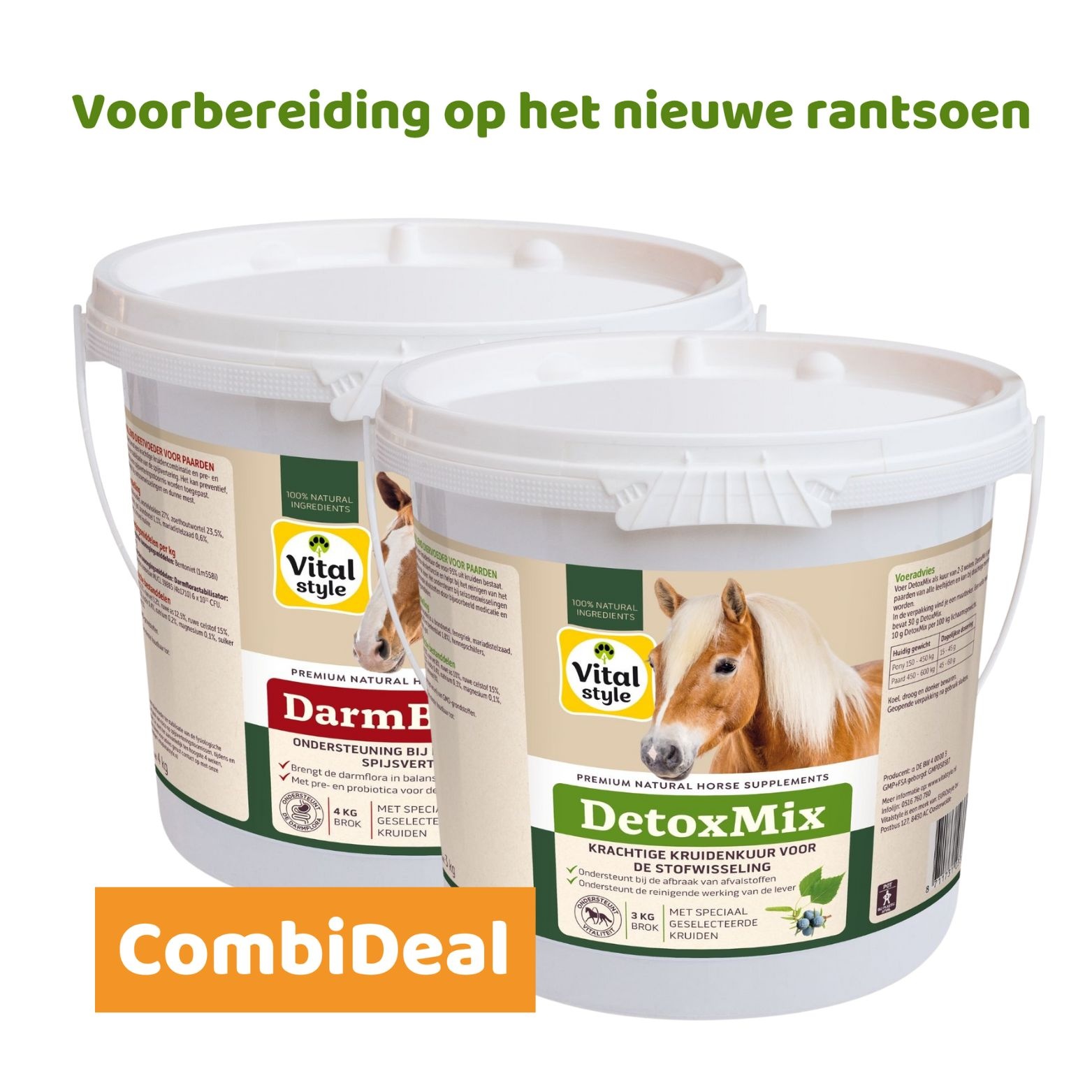 Wanneer je kiest voor ons exclusieve VITALstyle DetoxMix en DarmBalans pakket, geef je jouw paard de best mogelijke zorg. Dit pakket is speciaal samengesteld om de gezondheid van jouw paard van binnenuit te bevorderen. Bovendien profiteer je van aanzienlijke kostenbesparingen ten opzichte van het afzonderlijk aanschaffen van deze hoogwaardige supplementen.