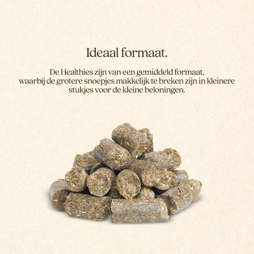 Healthies met Tijm zijn gezonde en lekkere paardensnoepjes voor alle paarden en pony's. De snoepjes zijn graanvrij, bevatten weinig suiker en zetmeel en zijn verrijkt met specifieke kruiden.