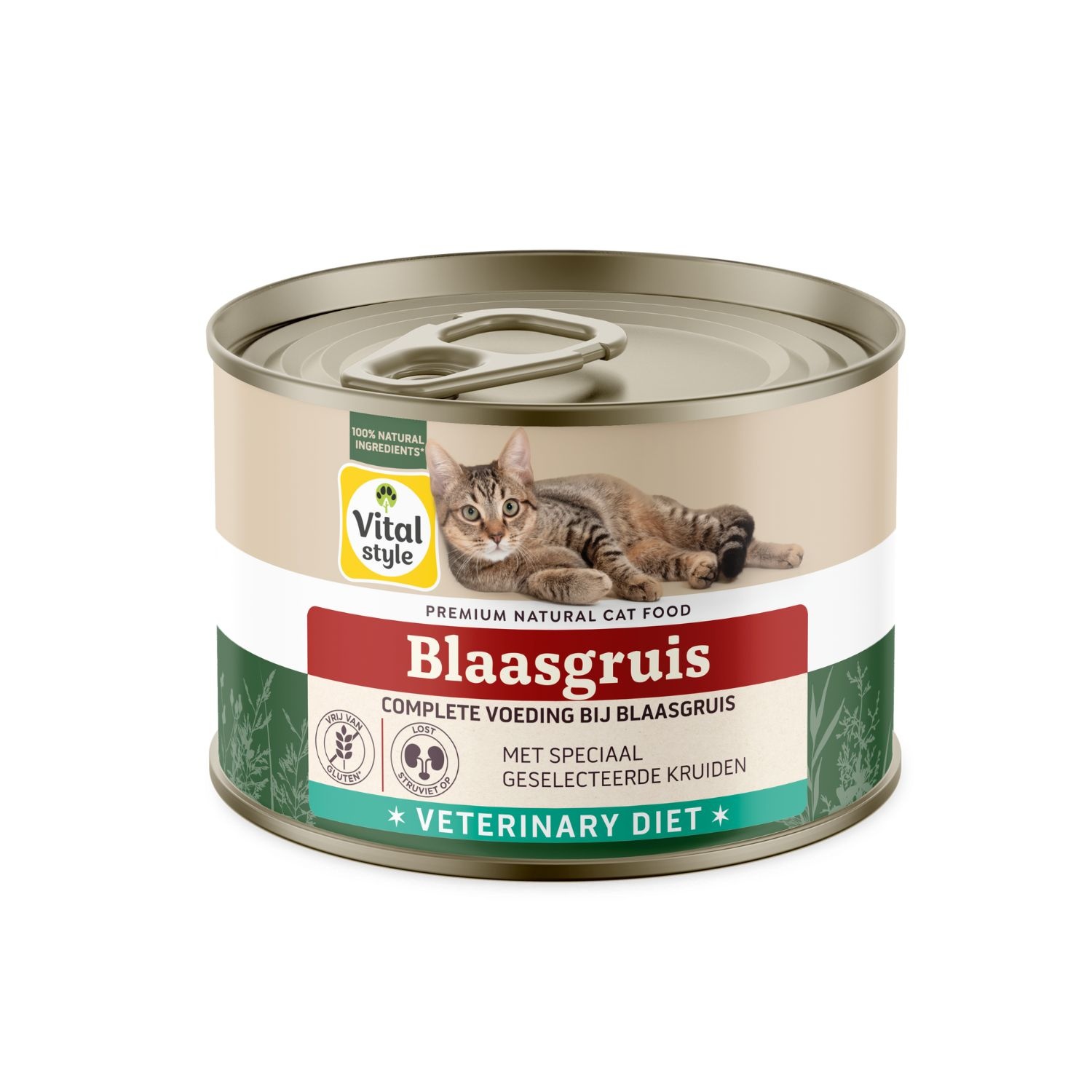 VITALstyle Blaasgruis Kat 24x200 gram bevat urineverzurende stoffen waardoor struviet- kristallen en stenen worden opgelost. Dit helpt al aanwezig blaasgruis (struviet) te verminderen. Het bevat een laag magnesium, fosfor en eiwitgehalte waardoor het risico op de vorming van struviet wordt verkleind.