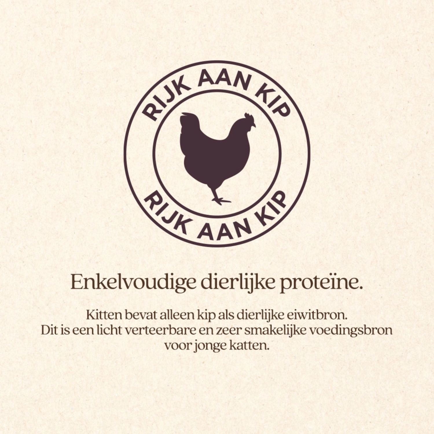 - KITTEN bevat puur natuurlijke ingrediënten. Dus zonder geur-, kleur-, smaakstoffen en conserveringsmiddelen. Er zijn geen suikers en zouten aan toegevoegd. En natuurlijk is deze voeding dierproefvrij!