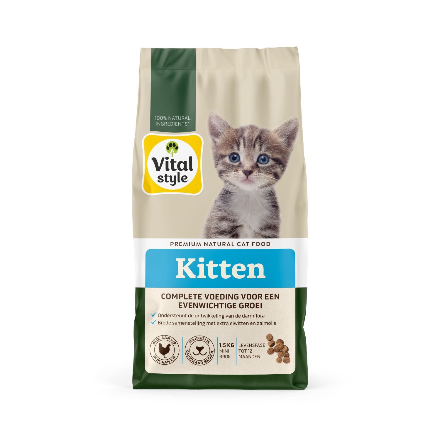- VITALstyle KITTEN bevat alles wat de jonge kat nodig heeft voor een gezonde en evenwichtige groei van botten, spieren, gewrichten, organen en gebit. De kat is in balans en dat zie je ook terug in het gedrag