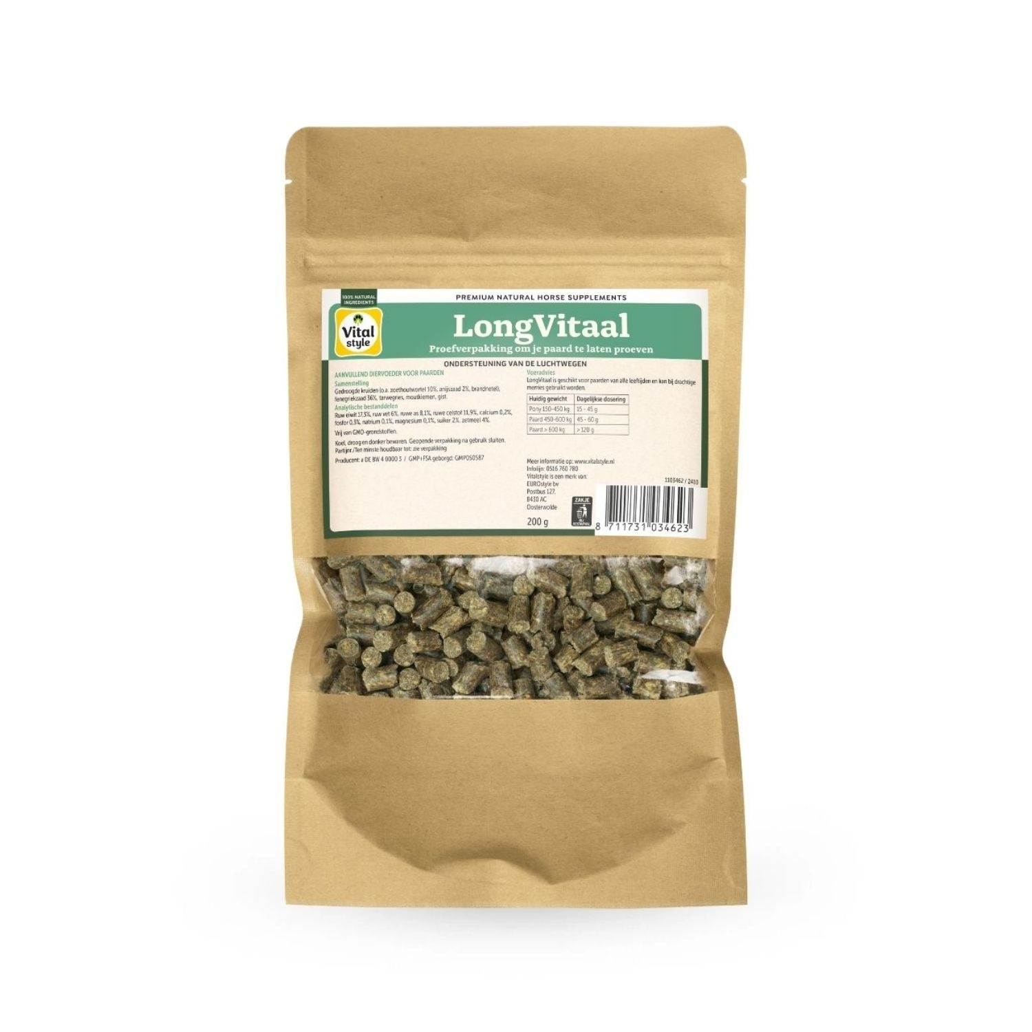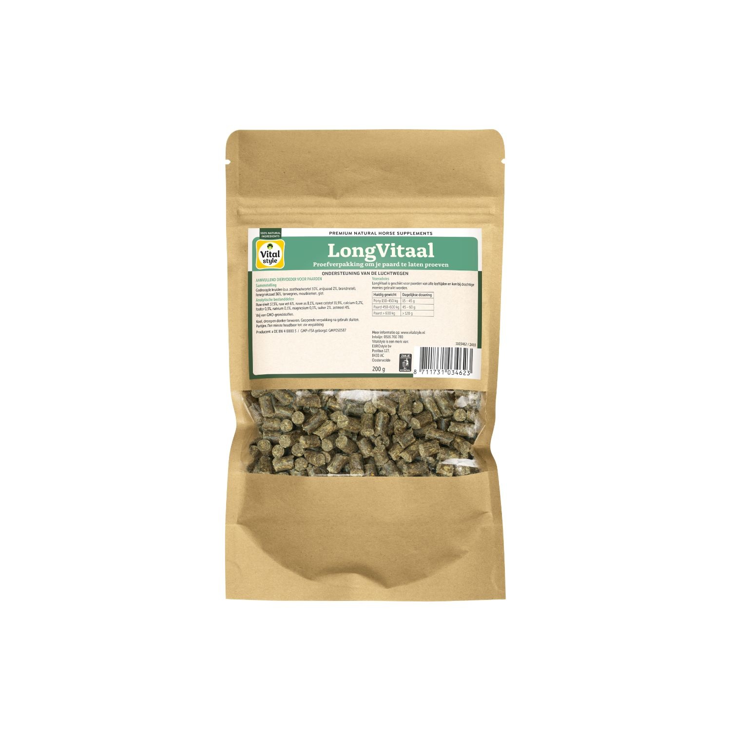 VITALstyle (voorheen ECOstyle) LongVitaal is een kruidenmengsel in brokvorm en ondersteunt sterke en gezonde luchtwegen. Het geeft paarden letterlijk meer lucht, mede dankzij de krachtige kruiden combinatie van fenegriek, brandnetel, zoethoutwortel en anijszaad. LongVitaal is daarom onmisbaar bij paarden met pollenkriebels, een kuch of kriebel in de keel! LongVitaal is samengesteld uit natuurlijke GMO-vrije grondstoffen. LongVitaal bevat 2% suiker en 4% zetmeel.