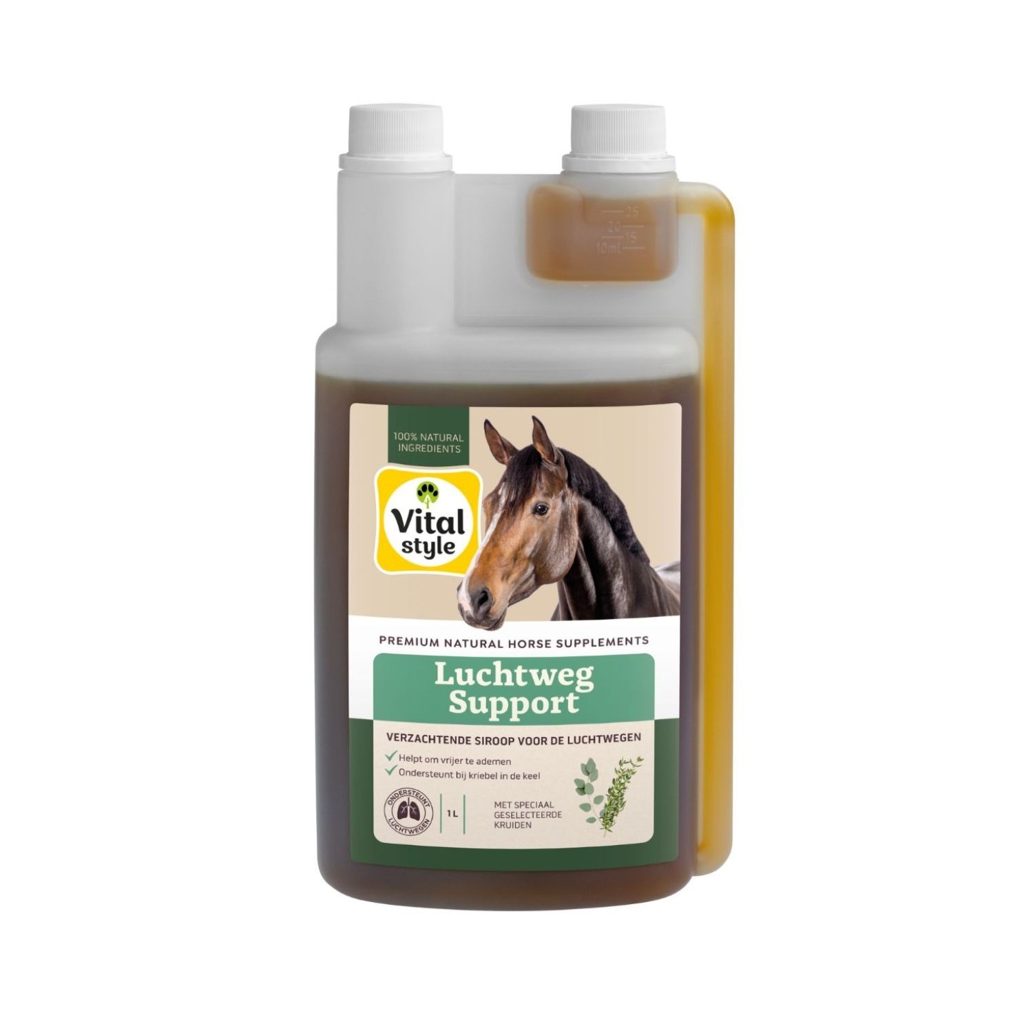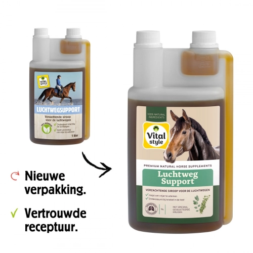 LuchtwegSupport van VITALstyle (voorheen ECOstyle) ondersteunt de luchtwegen van je paard optimaal. Deze verzachtende én natuurlijke siroop bevat krachtige kruiden die de conditie en weerstand ondersteunen en je paard comfortabel laten ademen. LuchtwegSupport brengt rust bij een kriebel in de keel.