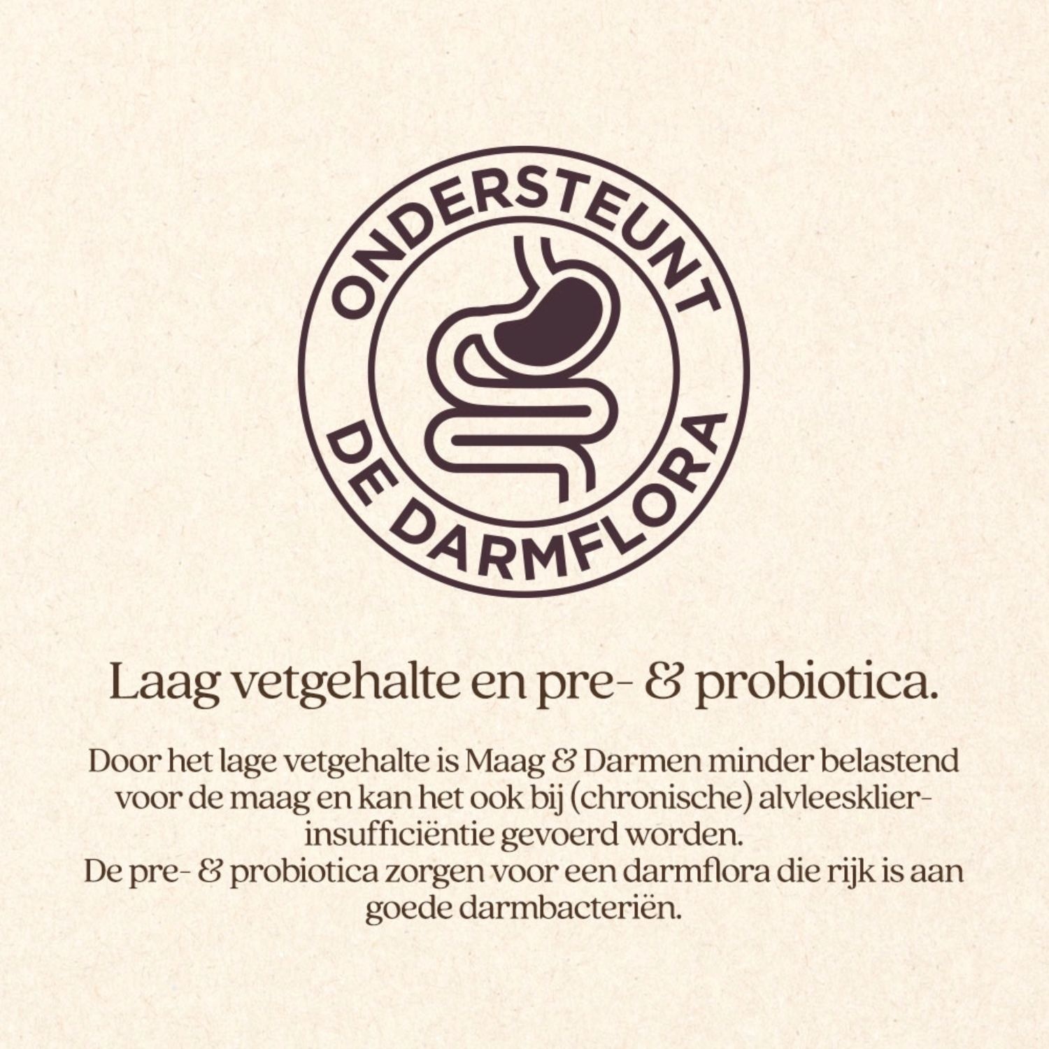 Vitalstyle Maag & Darmen hondenvoeding daagt de maag en darmen, organen en klieren uit hun werk maximaal te doen. De ingrediënten zijn goed verteerbaar, de voeding heeft een laag vetgehalte. Het gevolg is een goed werkende spijsvertering en een einde aan diarree, overgeven en buikpijn. De spijsvertering is in balans!