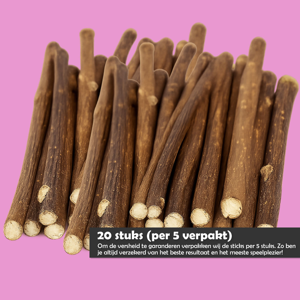 - Bied 1 stokje per keer aan voor 5–10 minuten speels kauwen.