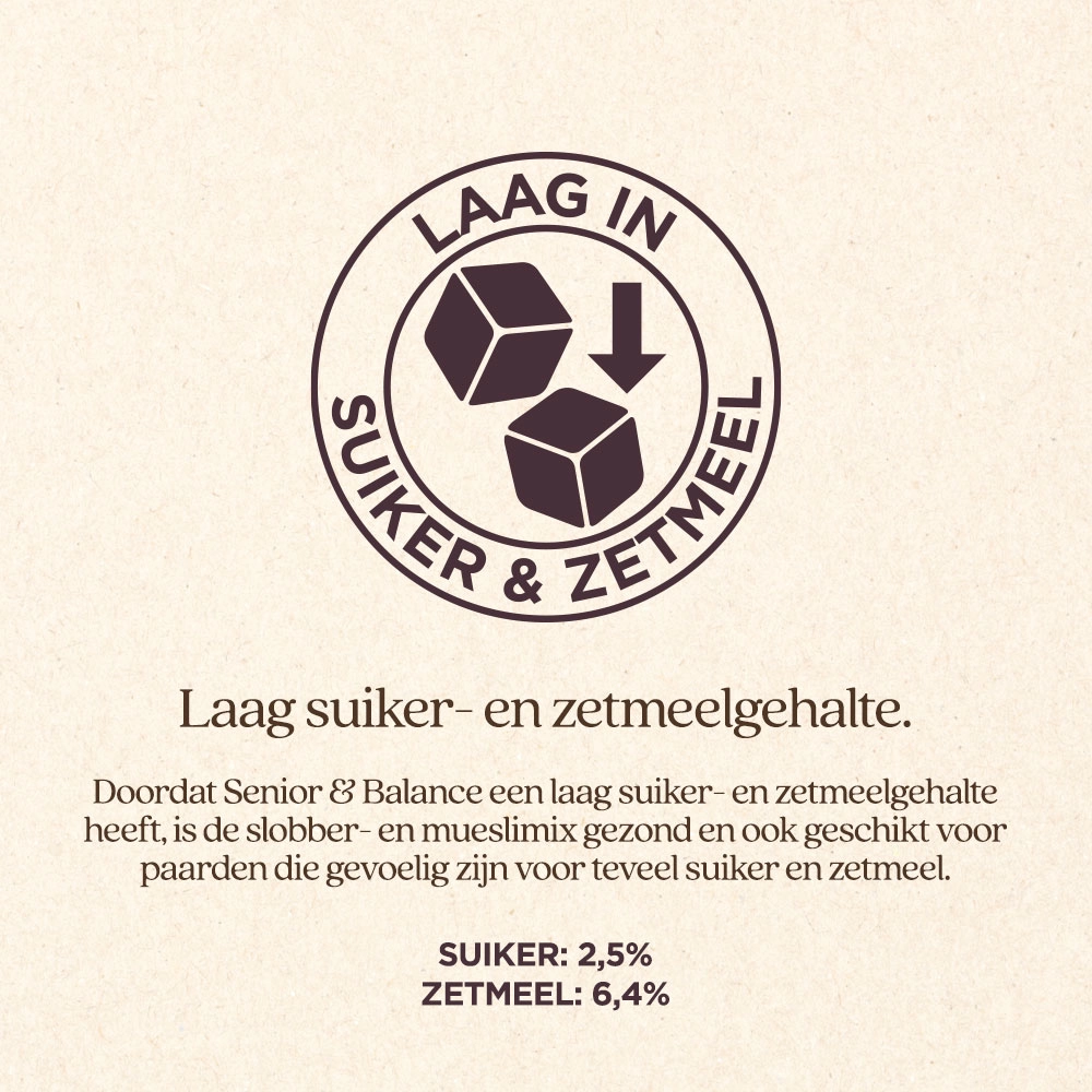 Senior & Balance is een gezonde mix van slobber en muesli, speciaal ontworpen als dagelijkse aanvulling of gedeeltelijke vervanging van ruwvoer voor oudere paarden. Deze mix voorziet in alle benodigde vitaminen en mineralen voor oudere paarden. Het bevat hoogwaardige, goed verteerbare vezels zoals timothee en lupinevlokken, die gemakkelijk te kauwen zijn en voldoende eiwitten en energie bieden om te voldoen aan de specifieke behoeften van oudere paarden.