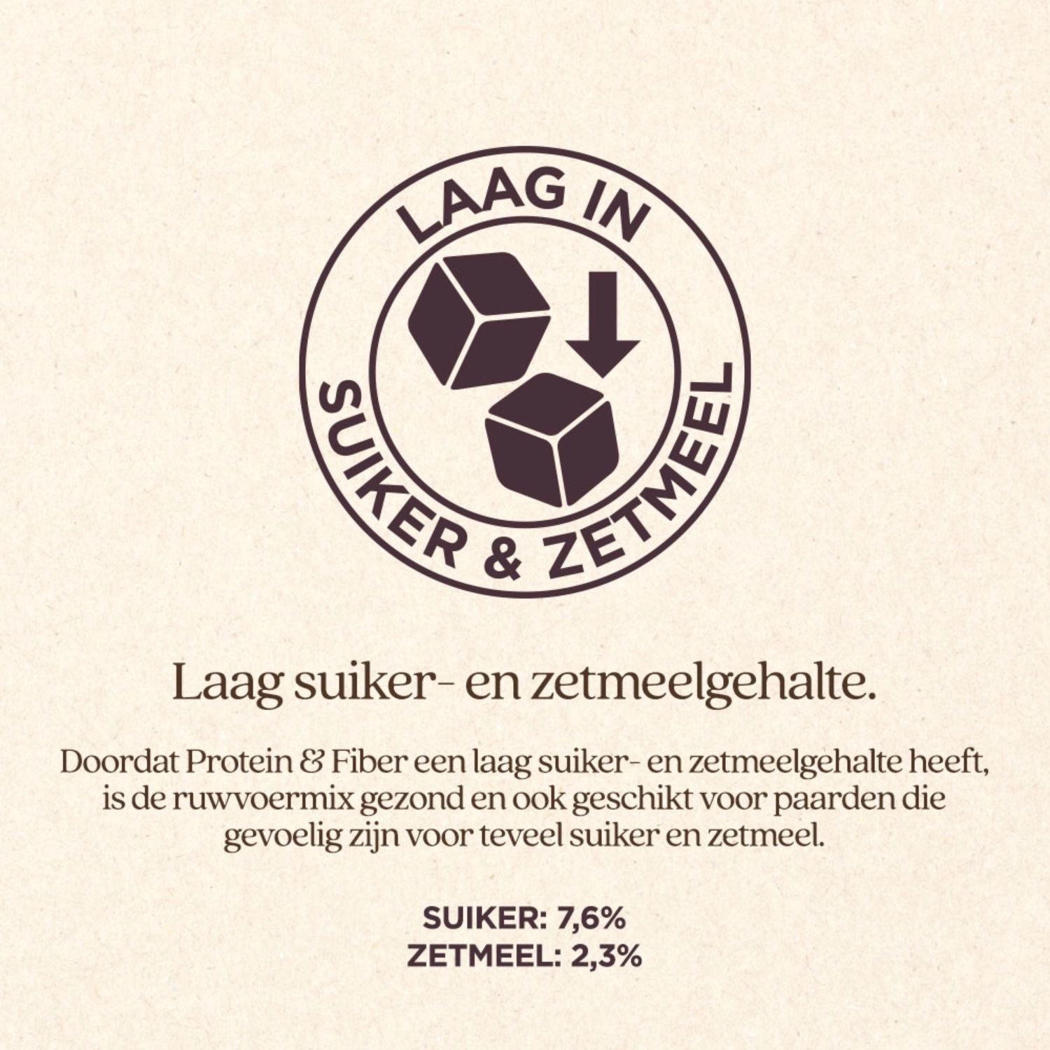 Protein & Fiber is een vezelrijke ruwvoermix die dagelijks kan worden gebruikt als aanvulling of gedeeltelijke vervanging van het ruwvoer. De mix bevat smakelijke, laag-fructose grassoorten en eiwitrijke ingrediënten zoals lupinevlokken en lijnzaadschilfers. Dankzij de zachte structuur en korte vezels stimuleert het kauwen en speekselproductie. Protein & Fiber is ideaal voor sportpaarden, jonge paarden in de groei of paarden die moeilijk op gewicht blijven. Het levert goed verteerbare vezels, gezonde omega-3 vetzuren uit lijnzaadolie en is vrij van granen, luzerne, melasse, suiker en zetmeel. Zonder toegevoegde vitaminen en mineralen kan het veilig gecombineerd worden met een balancer zoals OerBalans.