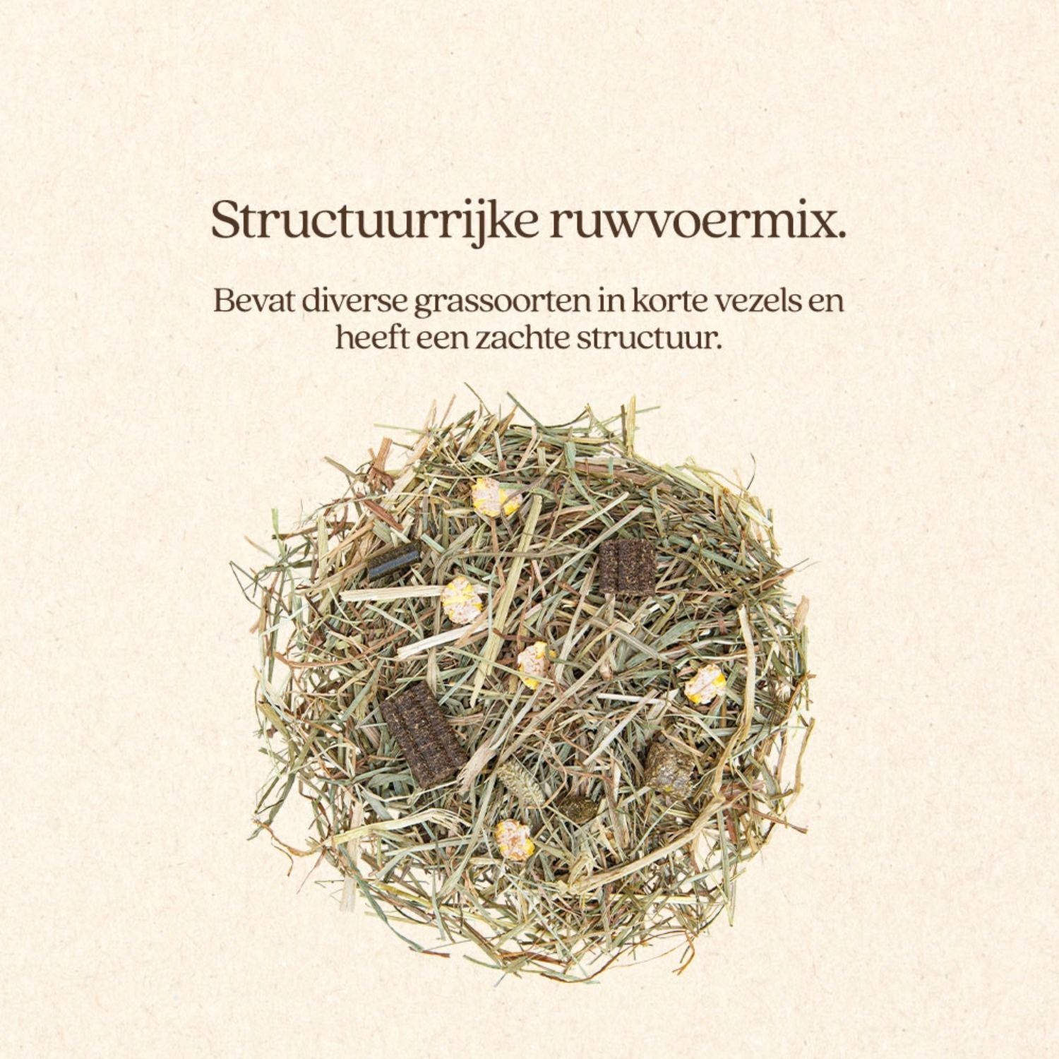 Mengsel van gedroogde grassoorten (timothee, kropaar, rietzwenk) 72%, zonnebloemzaadschroot, lijnzaadschilfers, zoete lupinevlokken 7%, lijnzaadolie 3,2%, grasmeel.