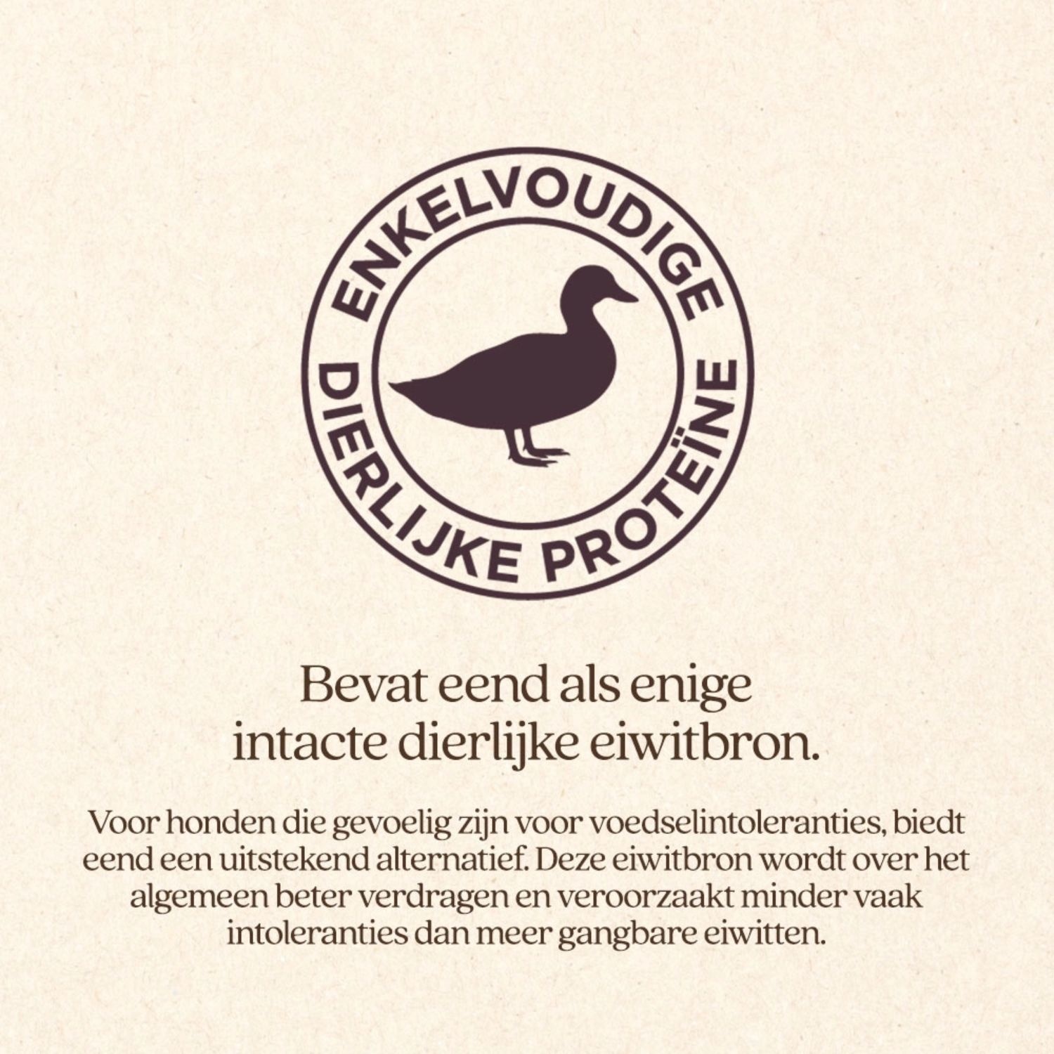 Eend 24% (gedehydreerd), zoete aardappel, aardappel (gedehydreerd), erwten, kippenvet 6,2%, gedroogde bietenpulp, gehydrolyseerde kippenlever 1%, kruidenmix (waaronder brandnetel 0,2%, paardenbloemwortel 0,15%, duizendblad 0,1%, frambozenblad 0,1%), zalmolie 0,5%, lijnzaad, gist.
