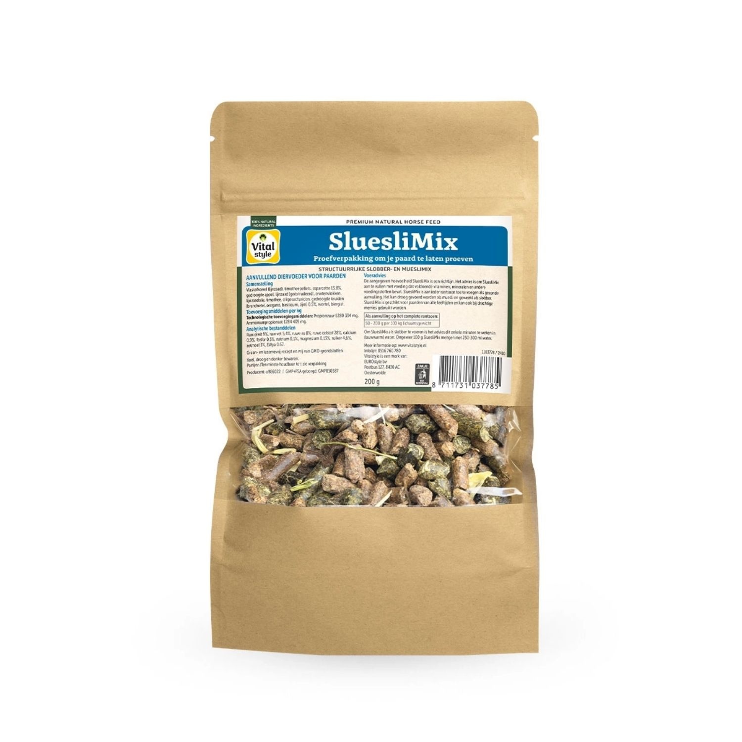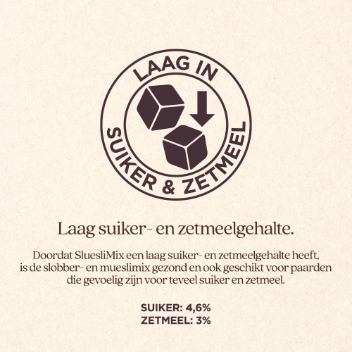 SluesliMix is een zeer luxe en gezonde aanvulling op het ruw- en krachtvoer. Deze muesli- en slobbermix heeft een laag suiker- en zetmeelgehalte, bevat hoogwaardige vezelbronnen en is verrijkt met prebiotica en smakelijke kruiden. SluesliMix is vrij van toegevoegd suiker, granen, soja en luzerne. Deze slobber- en mueslimix is droog, maar ook als slobber te voeren. Bijvoorbeeld om supplementen doorheen te mengen. Ook is SluesliMix vrij van toegevoegde vitaminen en mineralen. Zo kun je niet overdoseren en kan het goed met een balancer zoals OerBalans gecombineerd worden.
