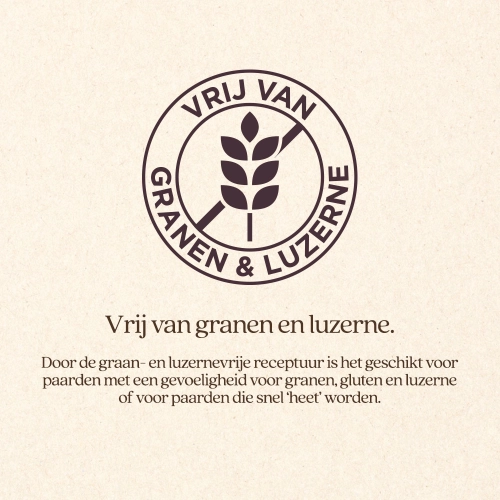 - Laag suiker- en zetmeelgehalte en vrij van granen, soja en luzerne