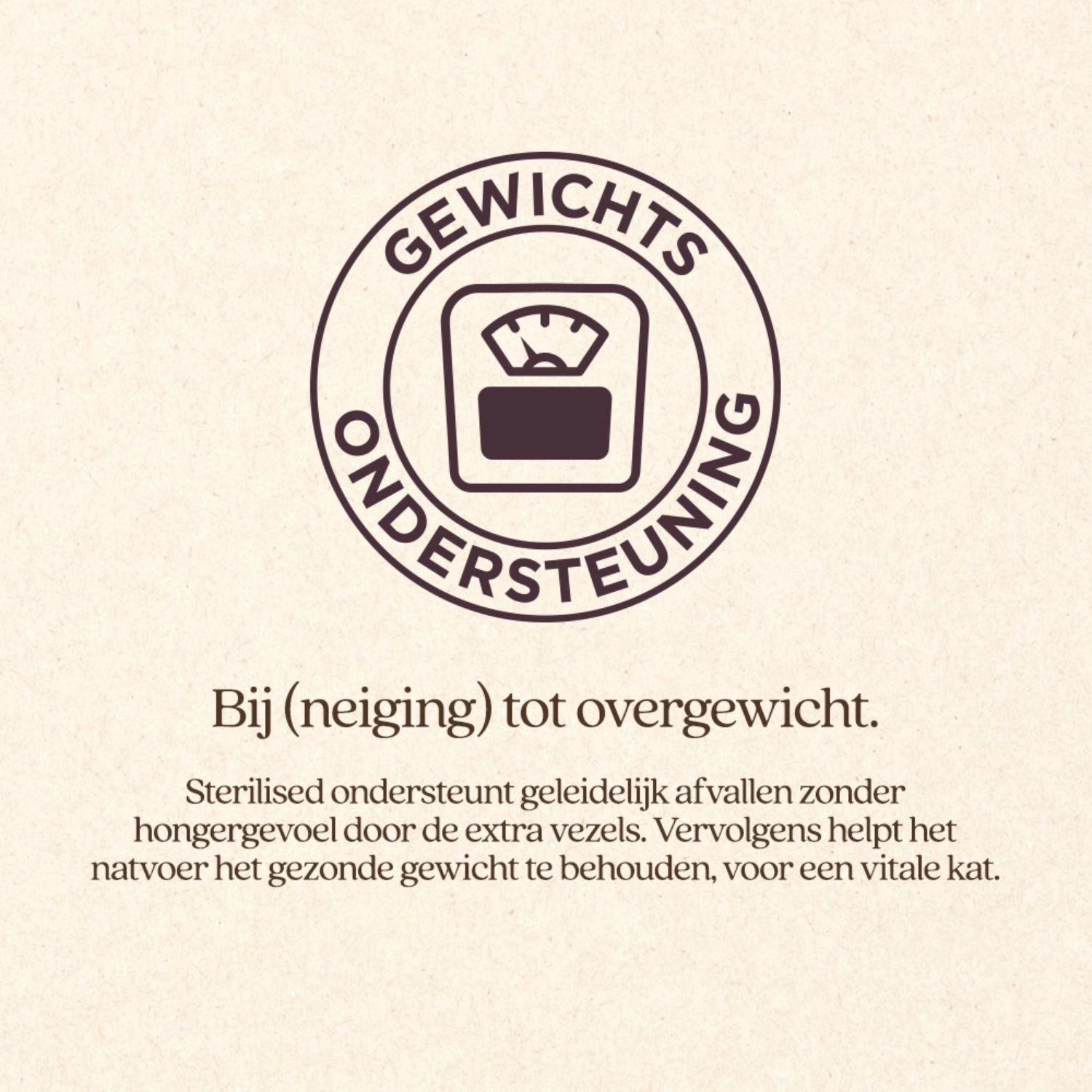 VITALstyle Sterilised (voorheen Overgewicht) stimuleert dat uw kat afvalt en zorgt tegelijk voor een verzadigd gevoel. De voeding heeft een laag vetgehalte, een hoog gehalte aan ruwe celstof en een lage energiewaarde. De ingrediënten zorgen voor een goede maag- en darmvulling. Uw kat heeft ondanks dat hij afvalt, geen hongergevoel.