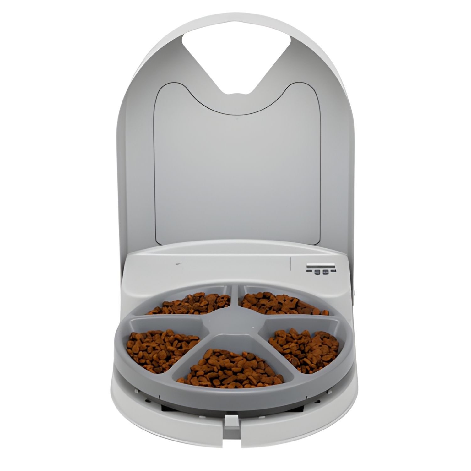 Met de PetSafe® 5-maaltijden-voerautomaat krijgt je huisdier ook dan op tijd zijn eten, als het voor jou een keer later wordt. De uitneembare schaal heeft 5 vakken, die je met 1 kopje droog of halfdroog voer kunt vullen.